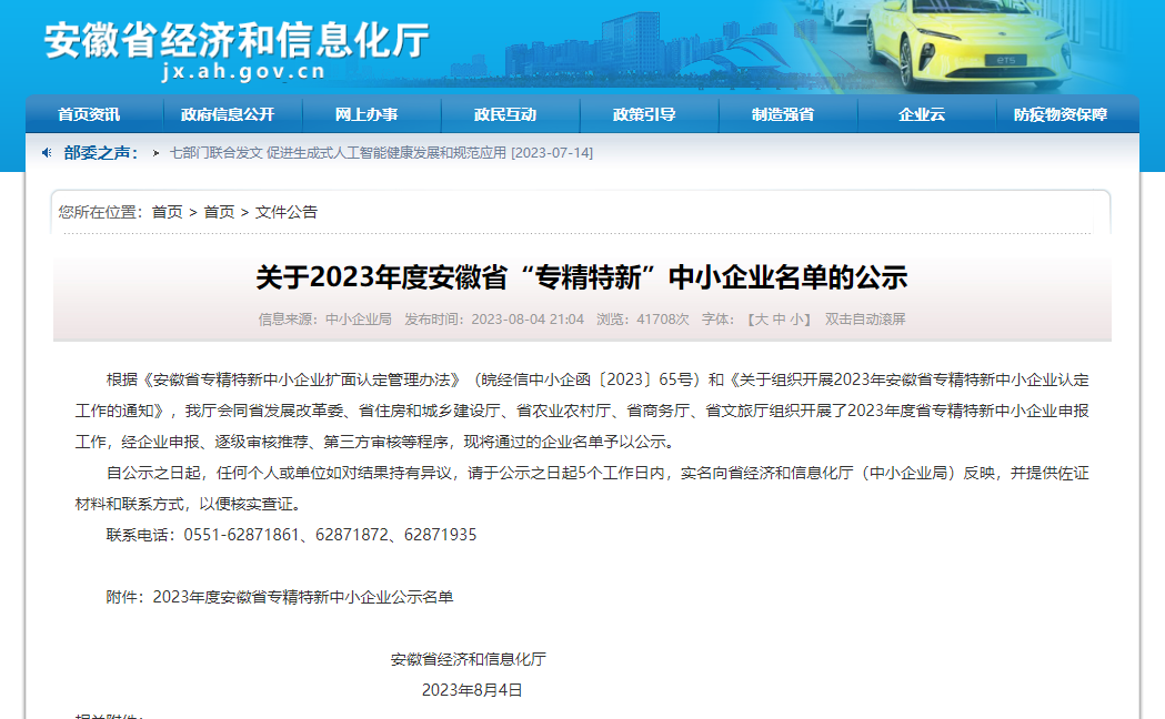 近日,安徽省经济和信息化厅发布《关于2023年度安徽省“专精特新”中小企业名单》公示,我院培育企业哈工特安、合滨智能、哈工亚南、哈工标致、哈工晶麒、哈工汽车6家企业上榜。