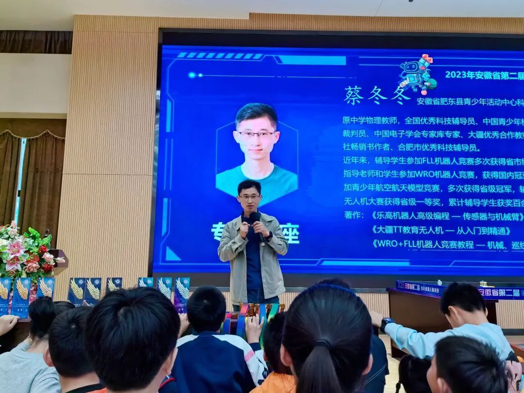 为进一步普及少儿机器人知识,来自安徽省肥东县青少年活动中心的蔡冬冬老师为在场选手和家长带来了一场通俗易懂的科普讲座。