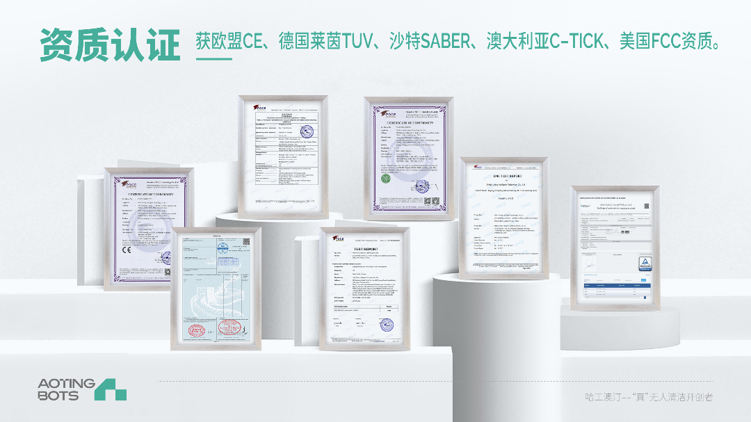 澳汀商用无水清洁机器人现已具备海外出口资质,顺利通过欧盟CE、德国TUV、澳大利亚C-TICK、美国FCC、沙特SABER等相关认证,特别是其中安规认证部分,标志着符合欧盟市场相关产品的安全标准。