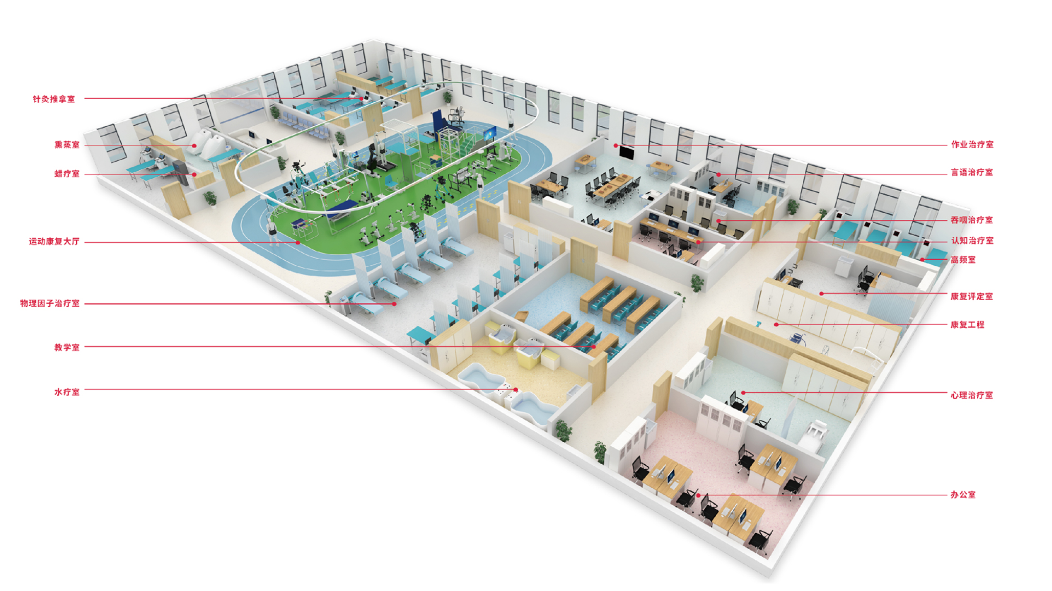 该康复中心整体解决方案集医疗、康复、护理、养老等功能于一体,包括老年康复、儿童康复、骨科康复、运动康复、神经康复和产后康复六大特色专科,设有熏蒸室、运动康复大厅、物理因子治疗室、水疗室、作业治疗室、言语治疗室、吞咽治疗室、高频室、康复评定室等功能区域,将医疗机器人、智慧康复医疗护理技术与临床实践相融合,满足康复行业高质量发展需求。