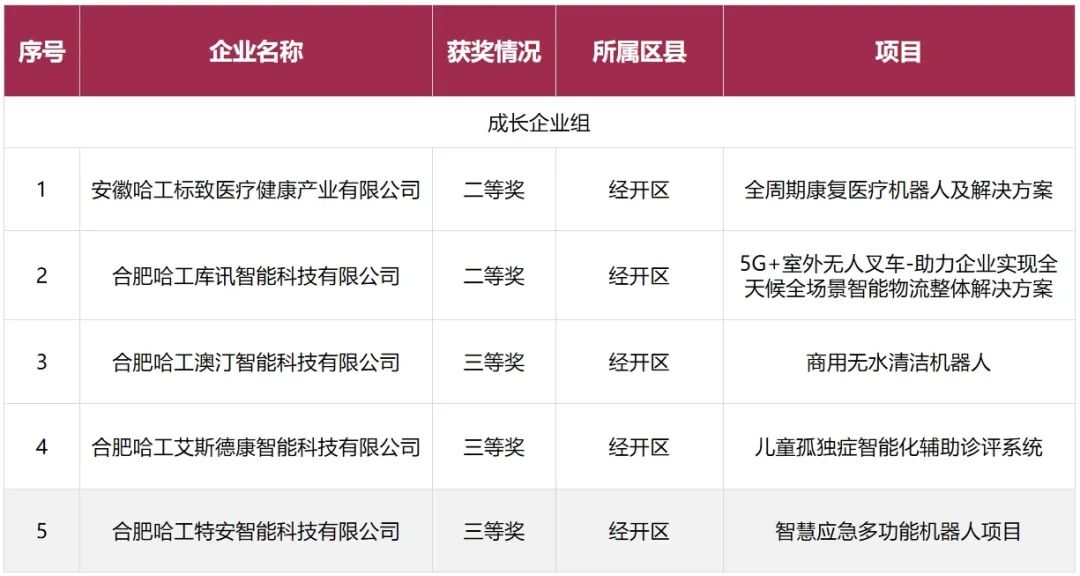 合肥市智能机器人研究院5家培育企业在第十二届中国创新创业大赛安徽赛区合肥市赛中获奖,哈工标致、哈工库讯荣获成长企业组二等奖,哈工澳汀、哈工艾斯德康、哈工特安荣获成长企业组三等奖。