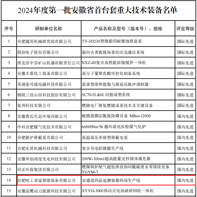 日前,安徽省工业和信息化厅公布2024年度第一批安徽省首台套重大技术装备名单,我院培育企业哈工龙延“双通道药品追溯装箱码垛生产线”榜上有名,这也是该企业产品第二次入选“首台套”,彰显了公司技术研发实力和市场前景。截至目前,合肥市智能机器人研究院拥有安徽省首台套重大技术装备达9家。