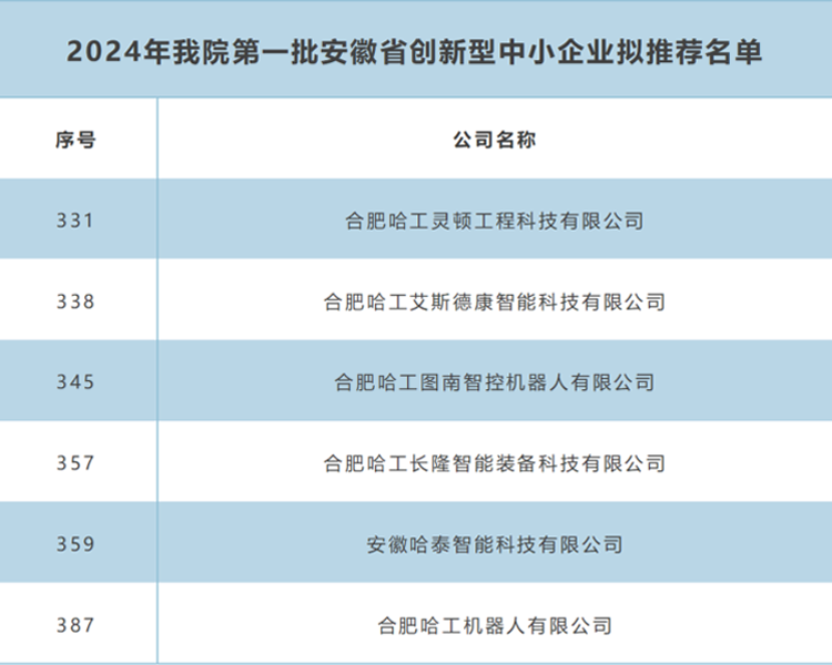 日前,合肥市工业和信息化局发布了2024年第一批安徽省创新型中小企业拟推荐名单的公示,合肥市智能机器人研究院6家培育企业榜上有名。