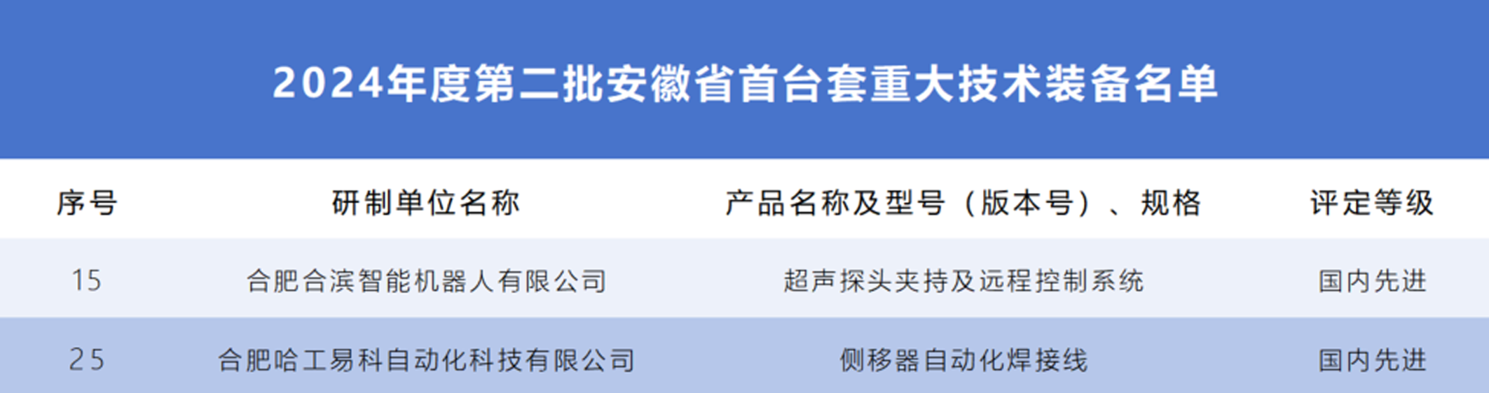 日前,安徽省工业和信息化厅公布2024年度第二批安徽省首台套重大技术装备名单,我院培育企业合滨智能“超声探头夹持及远程控制系统”、哈工易科“侧移器自动化焊接线”双双上榜,获评“国内先进”等级。截至目前,我院拥有安徽省首台套重大技术装备达11家。