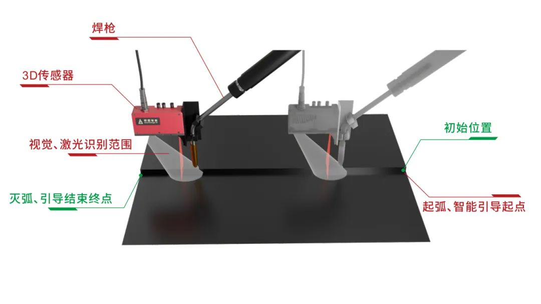 机器人带动传感器完成工件轮廓扫描动作;3D激光视觉传感器用于获取工件轮廓数据,形成三维点云;点云算法系统分析实际焊缝位置,自动生成焊接程序。