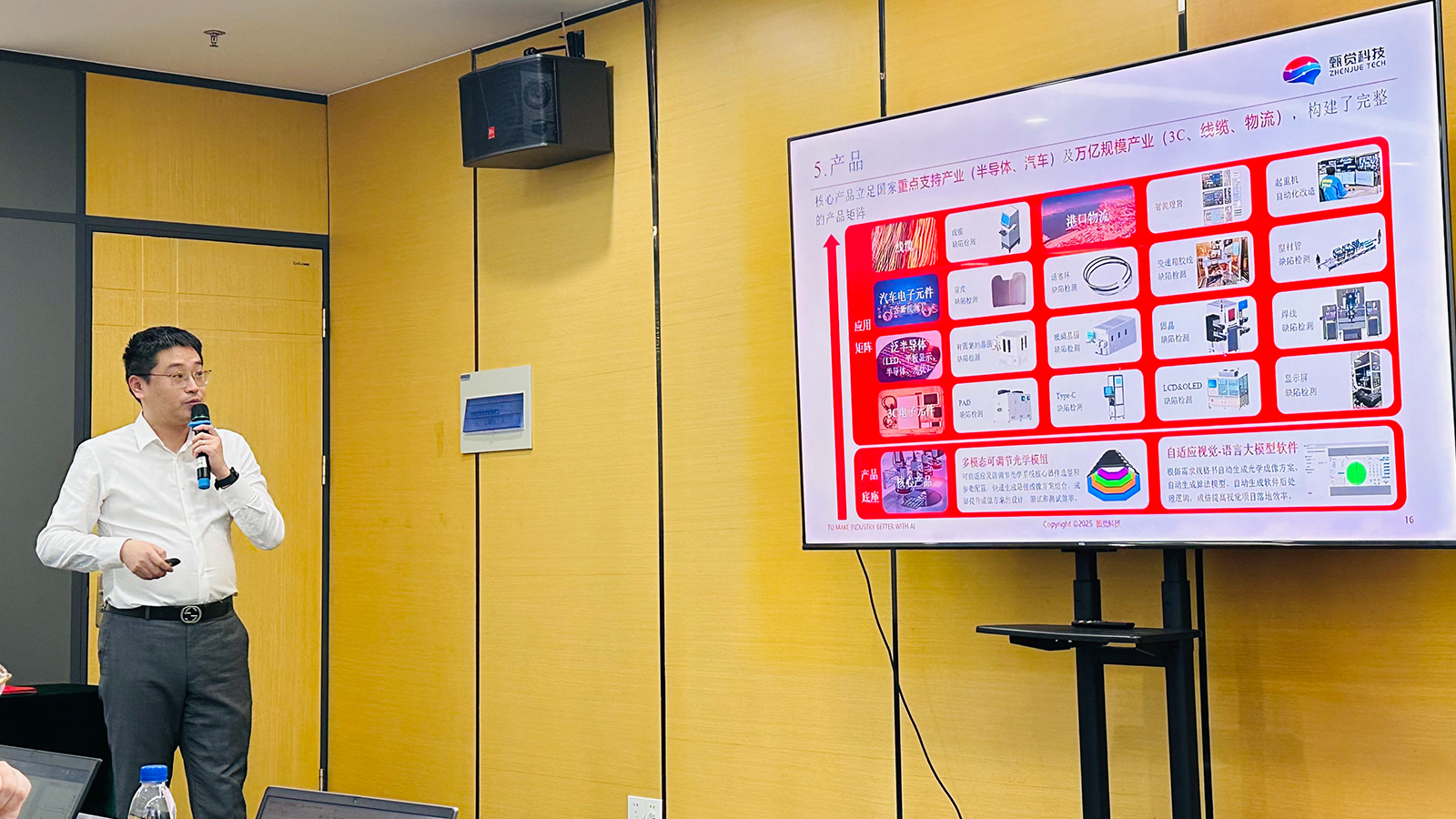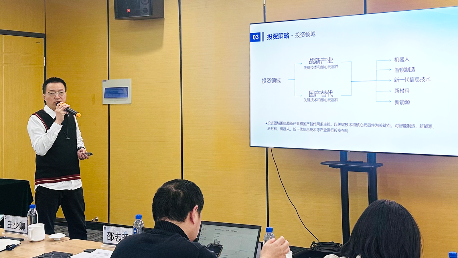 合肥唐圣基金合伙人董峰华介绍唐圣基金聚焦智能制造、机器人、新材料等领域”投资+赋能“的具体策略,助力研究院项目引入和培育发展。