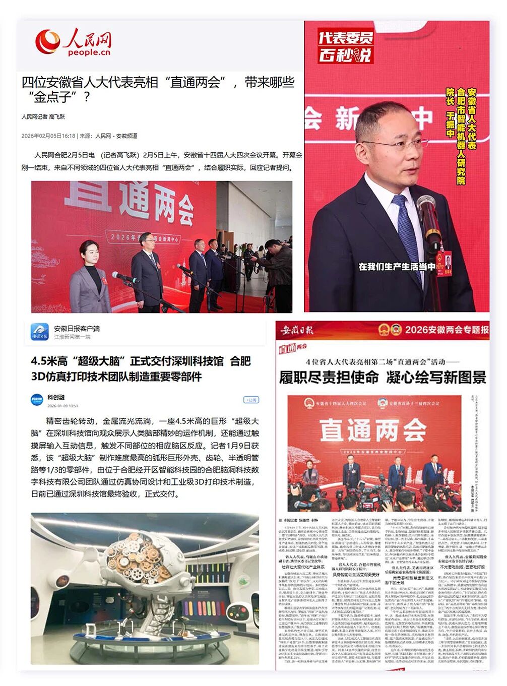 2026年1-2月期间,人民网、央广网、中国新闻网、安徽日报、安徽新闻联播、安徽商报、市场星报、中安在线、澎湃新闻、凤凰网等聚焦我院,围绕安徽省人大代表、我院院长于振中两会建议,以及我院培育企业投融资进展、产业发展情况进行报道,全面展示我院在科技成果转化与产业化进程中取得的突破进展。