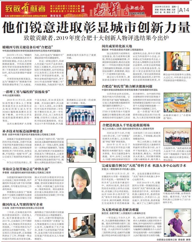 3月30日,由合肥市科技局、合肥市档案馆、合肥报业传媒集团联合主办的“2019年度榜样人物评选”最终名单公布。其中,哈工大机器人(合肥)国际创新研究院(以下简称:HRG合肥研究院)无人装备研究所荣膺“2019年度合肥十大创新人物”,“创新力量”、“社会责任”是其获奖的两大关键词。
