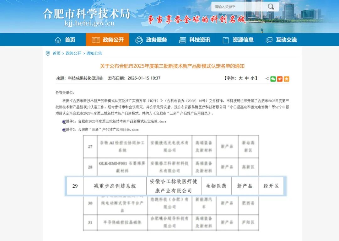 1月15日,合肥市科技局发布《合肥市2025年度第三批新技术新产品新模式认定名单》,安徽哈工标致医疗健康产业有限公司减重步态训练系统成功入选。